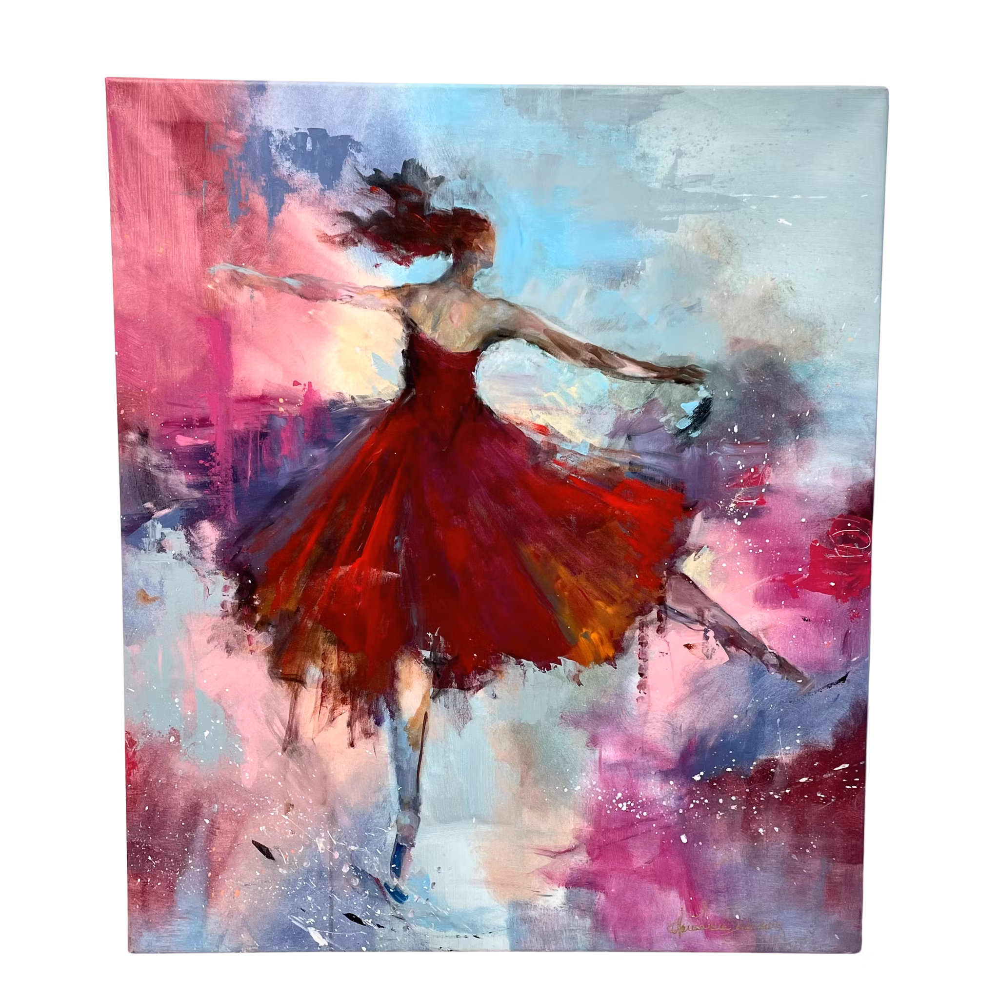 Bakgrunden är ett vibrerande landskap av rosa, violett, blått och vitt, där färgerna både omfamnar och driver fram dansarens rörelse. Den expressiva penselföringen ger målningen ett starkt momentum – som om färgerna själva är i rörelse. Den röda klänningen flammar ut i nyanser av orange och bourgogne, och står som ett kraftcentrum i målningen.