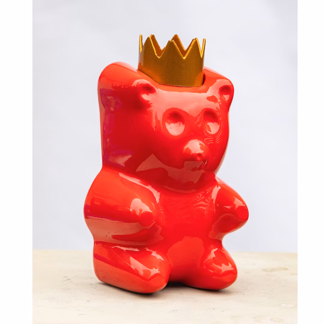 Skulpturen är en del av Adam Ströms Candy King-serie, där varje björn är ett unikt konstnärligt objekt som balanserar mellan lekfullhet och symbolik. I denna version är uttrycket starkt och självsäkert – färgen för tankarna till passion, begär och energi, medan formen påminner om barndomens godisfantasier. Det är en skulptur som gör popkonsten personlig.