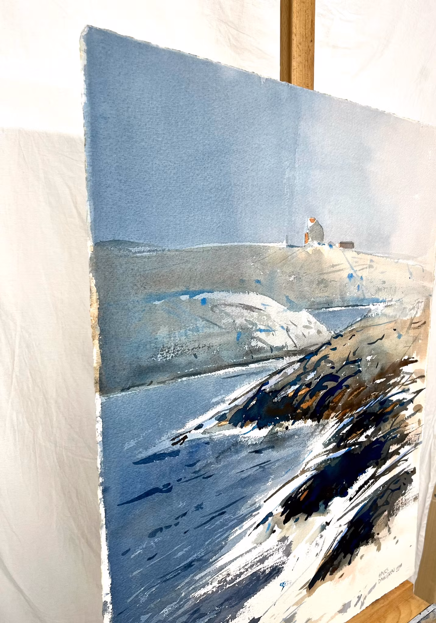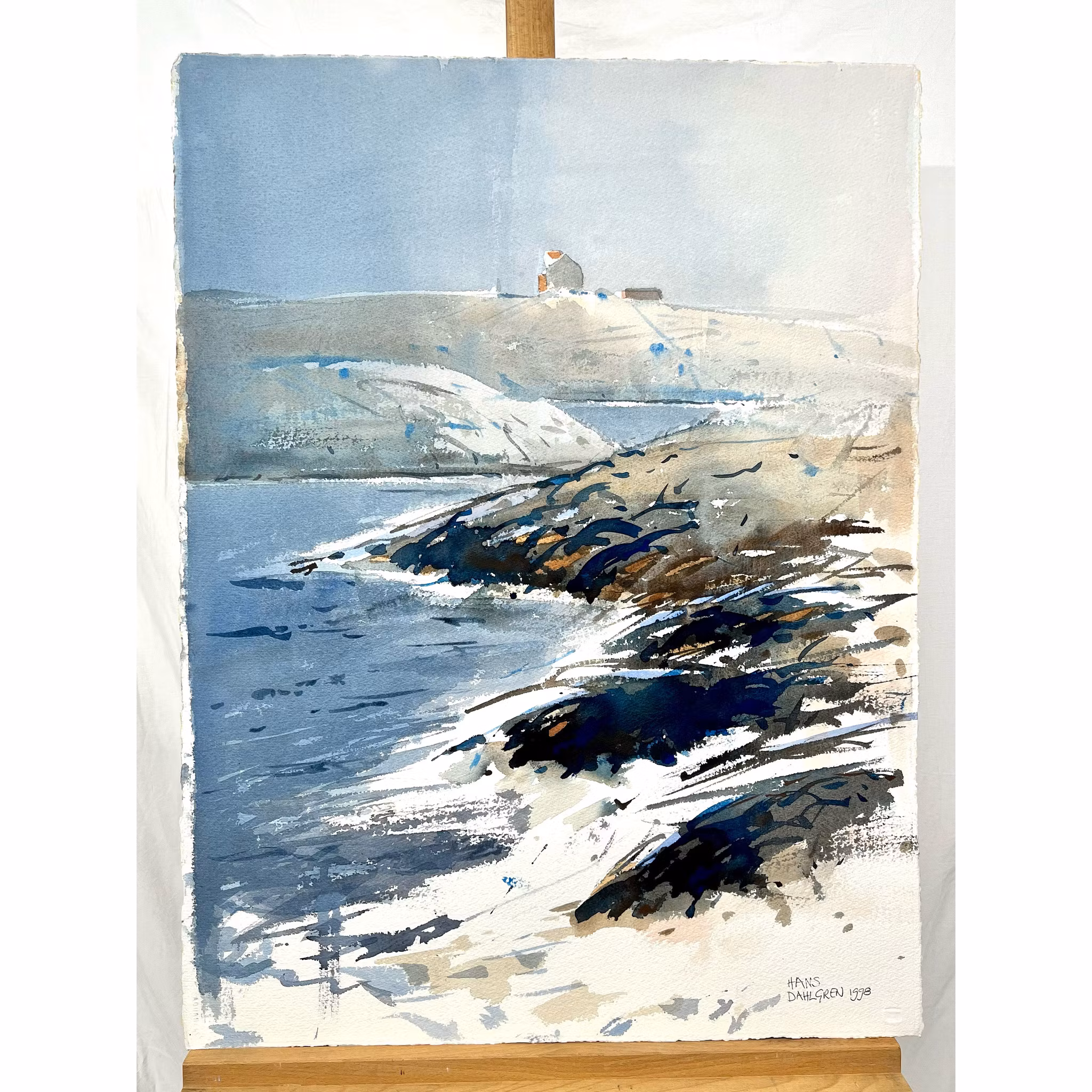 Denna konstnärliga skildring av klippiga kustlinjer och det unika landskapet som kännetecknar Bohuslän blev förevigat 1998. Hans Dahlgren har med akvarellens subtila och transparenta färger fångat ljusets speglingar på vattnet och klippornas konturer på ett mästerligt sätt.