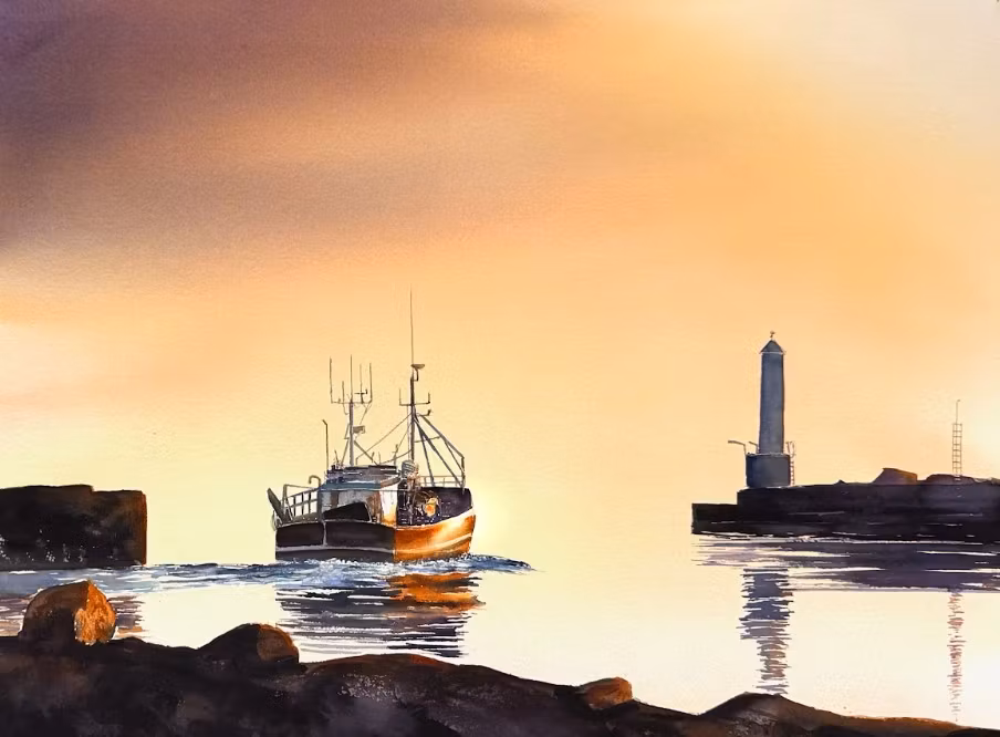 Båten bryter vattenytan och skapar subtila rörelser i den annars stilla hamnen. De mörka stenpartierna i förgrunden ramar in scenen och förstärker djupet i kompositionen. Fyren och piren till höger ger motivet balans och riktning, medan himlens varma toner ger målningen en lugn men levande atmosfär. Akvarellens transparens låter ljuset bära hela scenen utan att tappa detaljrikedom.