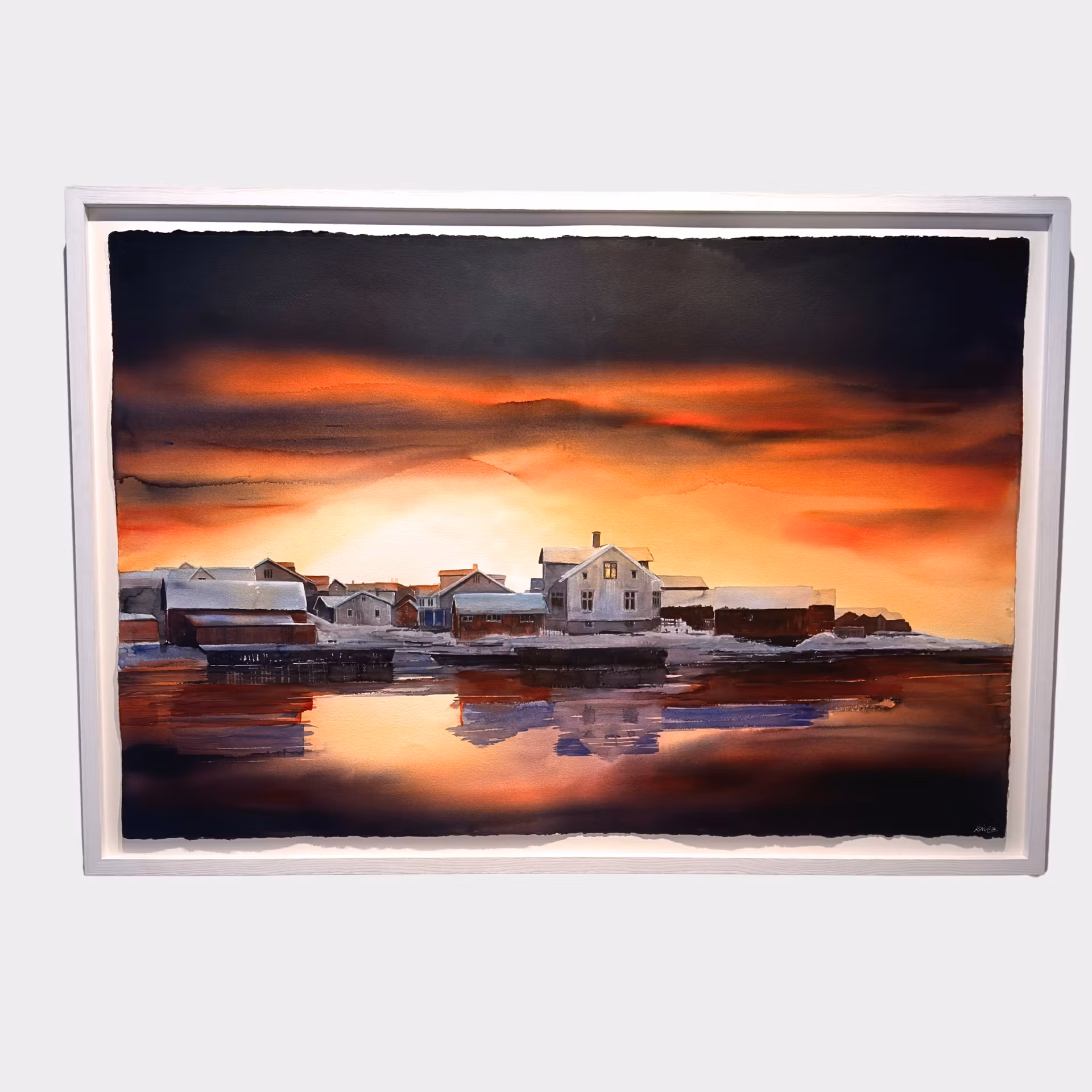 De snötäckta huskropparna ligger tätt längs kajkanten medan himlen brinner i varma toner av orange, rött och djup indigo. Vattnet speglar färgerna och skapar en nästan abstrakt spegelbild under den stilla ytan. Kontrasten mellan den kyliga bebyggelsen och den intensiva himlen ger verket en stark visuell närvaro, samtidigt som akvarellens transparens skapar mjuka övergångar och ett levande ljus. Formatet är generöst och gör målningen till ett självklart blickfång i ett större rum.