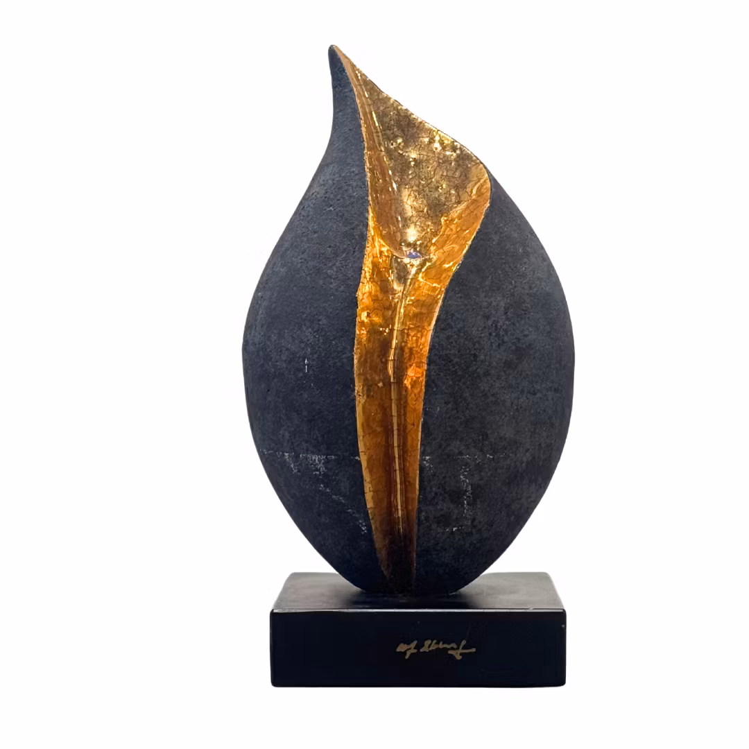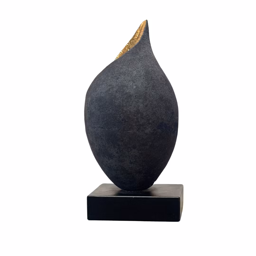 I detta verk, "Päron", förenar Ekberg det stilrena och det expressiva i en skulptur som påminner om en frökapsel eller en frukt som just öppnat sig. Den matta, mörka ytan av laserat stengods skapar en elegant kontrast mot den gyllene insidan, där bladguld lyser upp verket och framhäver skulpturens inre rörelse. Formen är enkel men samtidigt dynamisk, där den öppna linjen i guld leder betraktarens öga genom verket.