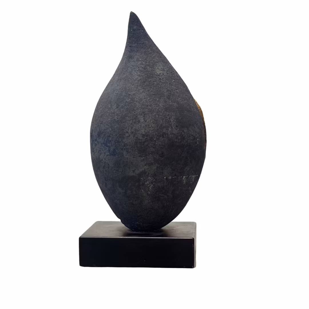 Skulpturen vilar på en träsockel, vilket ytterligare förstärker känslan av balans mellan det naturliga och det förädlade. Ett elegant, tidlöst verk som fungerar lika bra i en modern miljö som i en klassisk inredning.