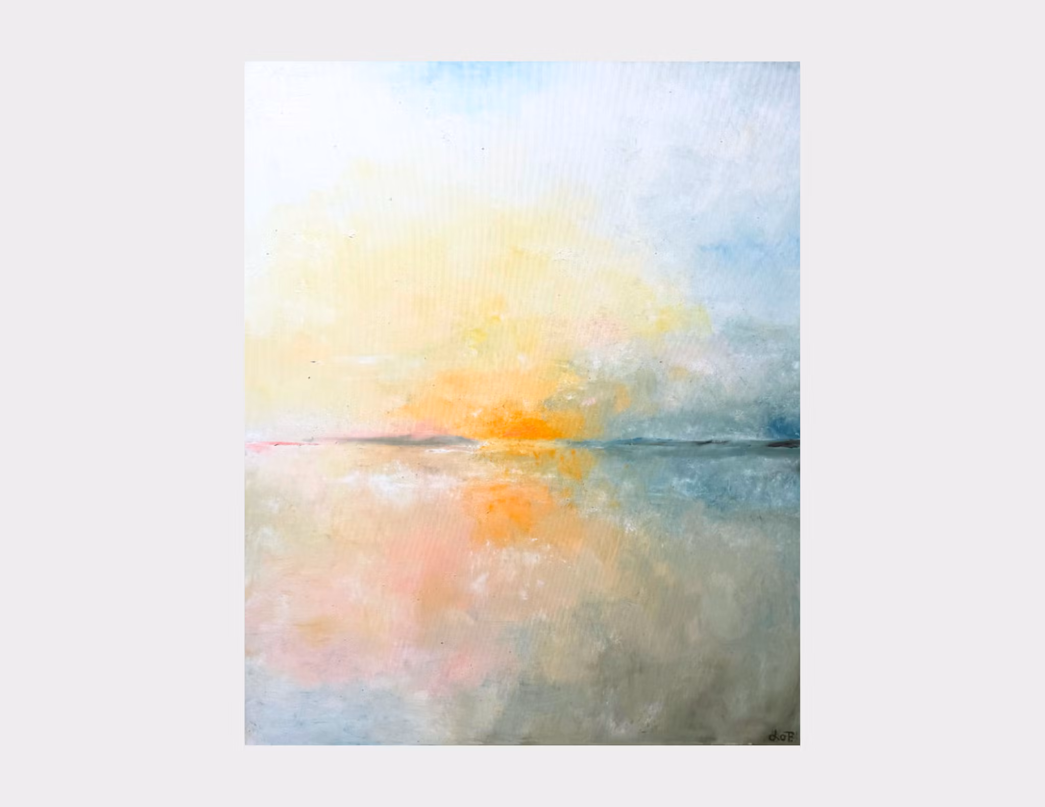 I "Uppvaknande" målas en tidlös morgonscen där solen sakta stiger över en spegelblank horisont. Med mjuka toner av gult, orange och blått fångar Fehrling ljusets gradvisa framträdande och naturens subtila rörelse. Målningen är ett meditativt verk som skapar lugn och en djup kontakt med världens tidiga timmar.