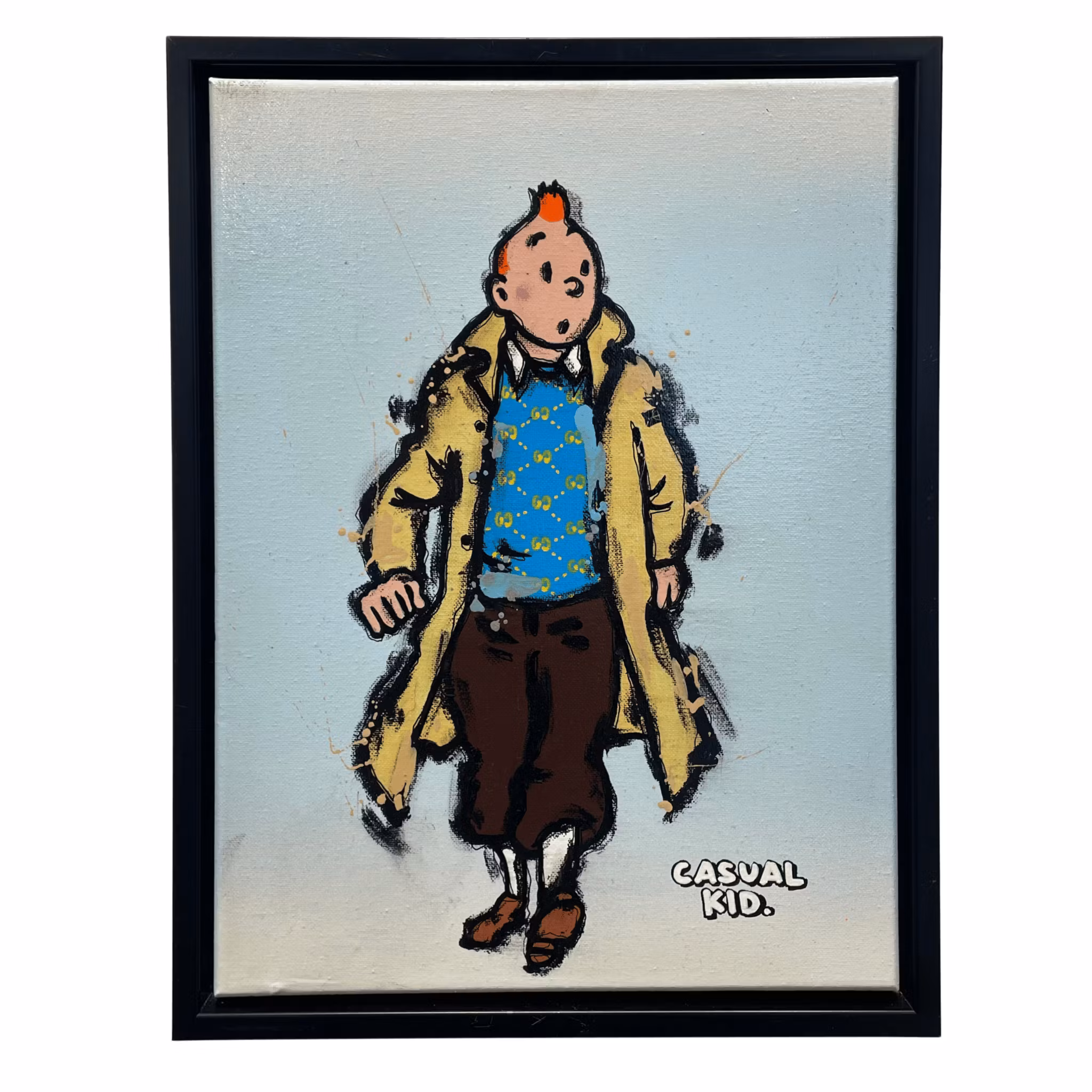 Casual Kid (Blue) är en målning med självsäker blick och färgstark precision. Den centrala figuren, iklädd himmelsblå Gucci-tröja och beige rock, står som en symbol för hur populärkultur kan få ny innebörd genom konstnärlig omtolkning. Linjerna är kraftfulla men samtidigt spontana, färgerna noga valda men med ett drag av improvisation – en balansgång som är typisk för Mike Blomqvists arbetssätt.