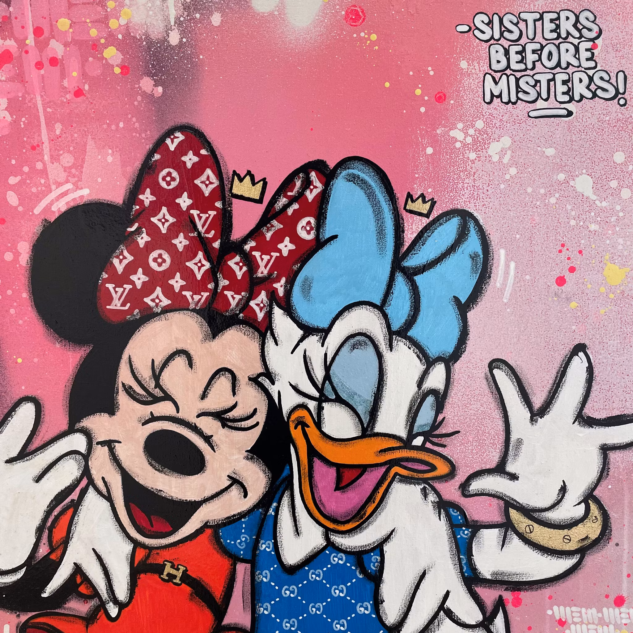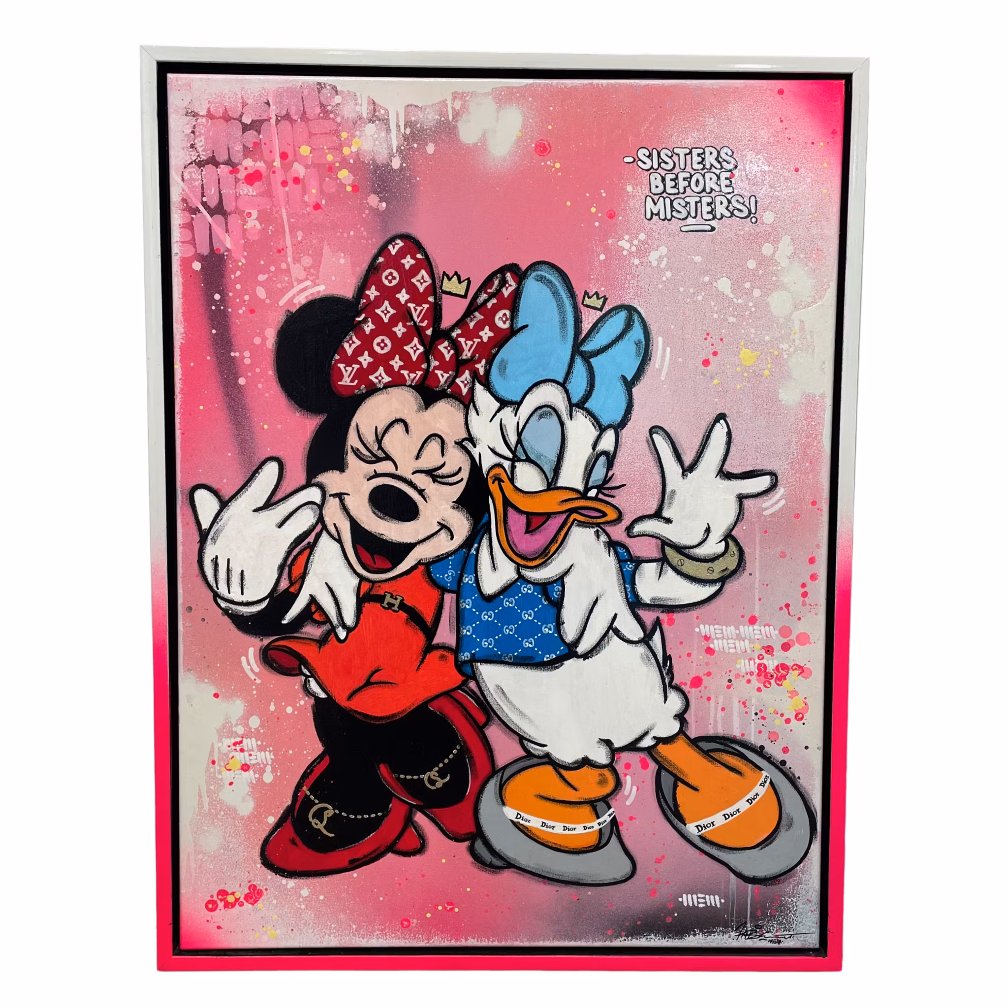 Mimmi Pigg och Kajsa Anka fångas i ett skrattfyllt ögonblick i denna lekfulla hyllning till systerskap och vänskap. I sina färgstarka designer-outfits, med Louis Vuitton-rosett och Gucci-skjorta, omfamnar de varandra framför en intensiv rosa bakgrund fylld av spraydetaljer, stänk och popkulturella referenser. Ovanför dem lyser texten: “Sisters before misters!” – ett slagkraftigt statement i sann street art-anda.