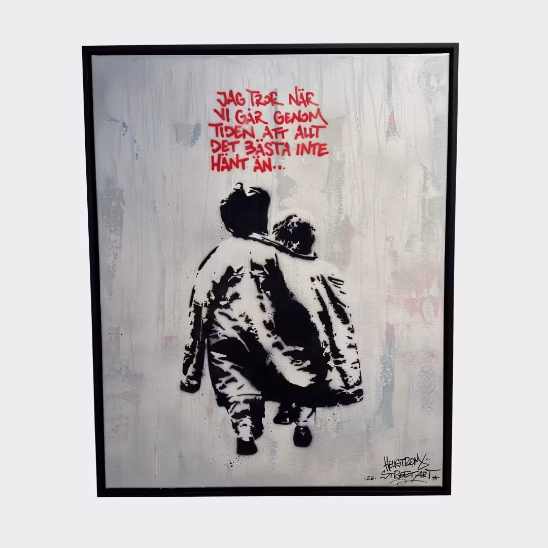 Hellstrom Street Art - Jag tror när vi går genom tiden att allt det bästa inte hänt än. - Stencil på duk. 104x84 cm