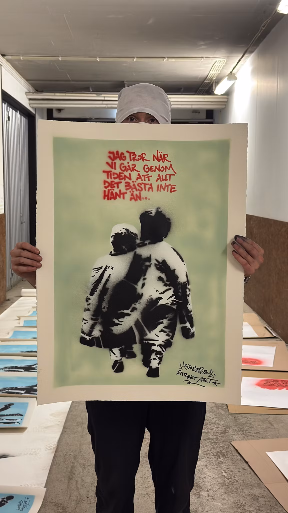 Hellstrom Street Art - Jag tror när vi går genom tiden att allt det bästa inte hänt än. - Stencil på papper. 56x76 cm