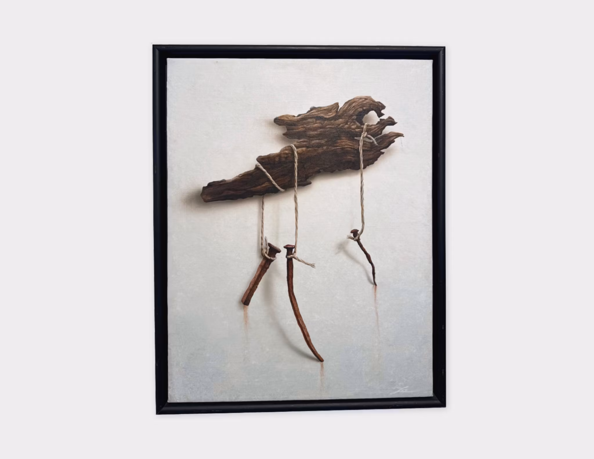 I Nails tar Jonas Brodin sin hyperrealistiska teknik till en nästan meditativ nivå. Ett stycke väderbitet trä med fastbundna rostiga spikar framträder mot en vit, avskalad bakgrund. Motivet är på samma gång enkelt och laddat – träet bär spår av tidens gång, medan spikarna hänger som reliker, bundna men samtidigt frigjorda från sin ursprungliga funktion. Brodins känsla för ljus, struktur och materialitet gör att betraktaren nästan kan känna träets grova yta och metallens kyla. Det är en målning som talar om minne, förgänglighet och det som blir kvar när något brister. Den stilla kompositionen och den subtila dramatiken gör verket starkt, samtidigt som det behåller en lågmäld elegans som gör det lättplacerat i hemmet.
