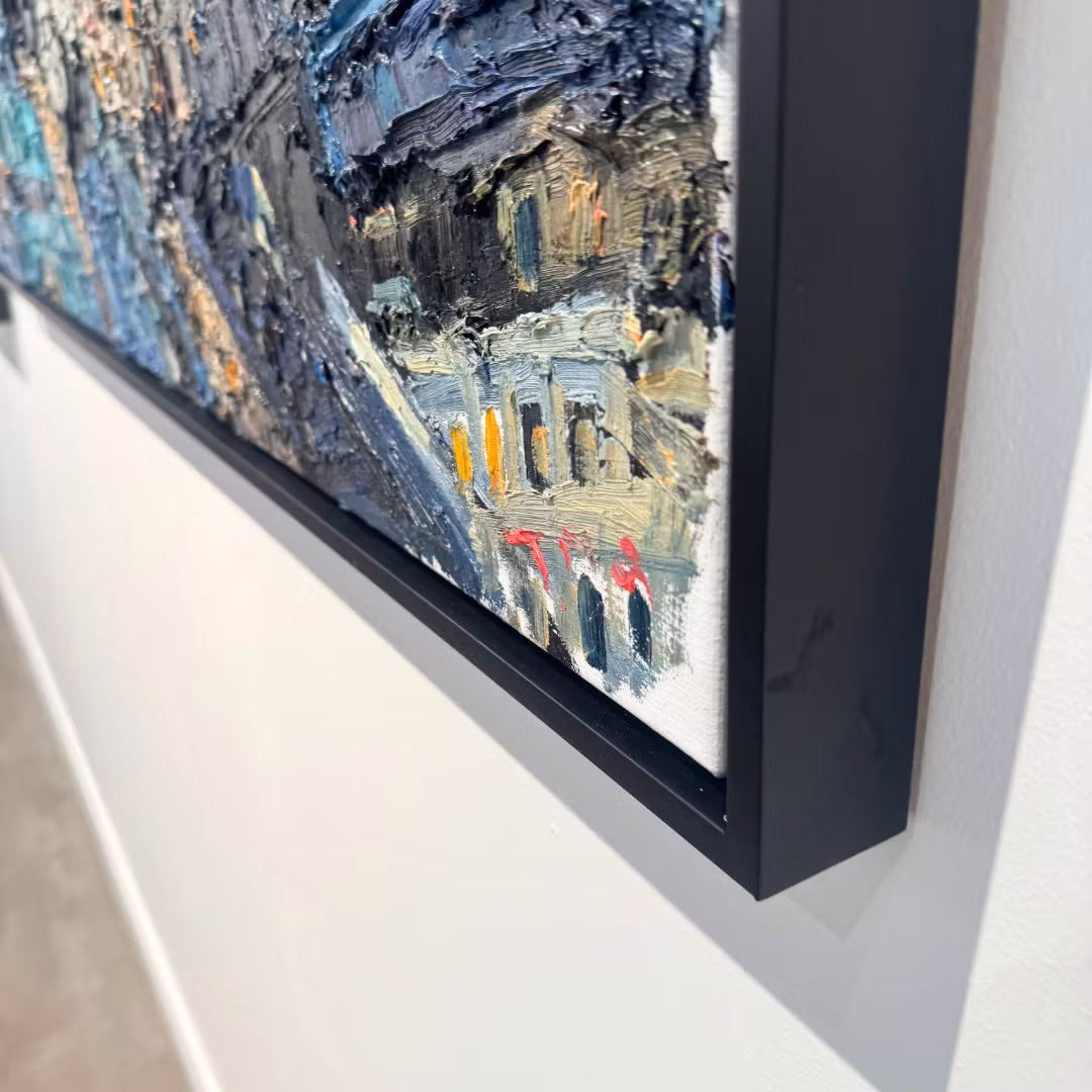 Med sitt karaktäristiska impasto-måleri bygger John Ma upp Stockholm med kraft och precision. De tjocka lagren oljefärg skapar en fysisk närvaro – en stad som nästan går att känna under fingrarna. Ljuset är hans främsta motiv, ett ljus som inte beskriver detaljer, utan väcker stämningar och minnen.